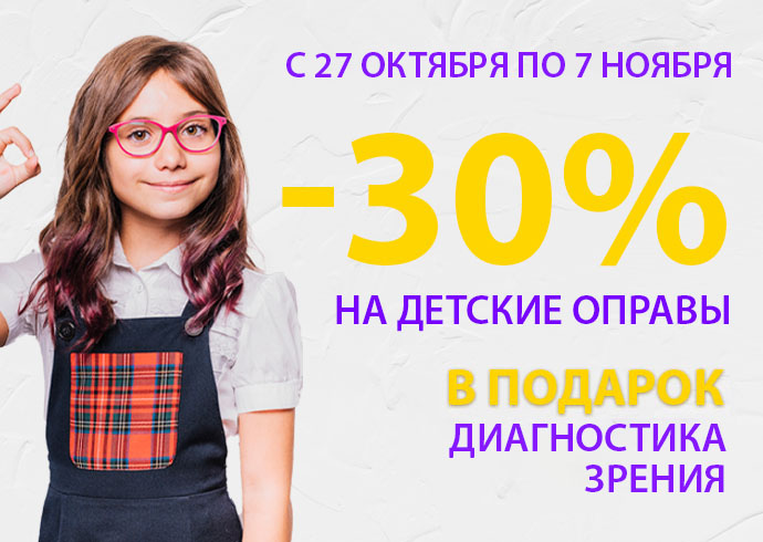 С 27 октября по 7 ноября -30% на все детские оправы при условии заказа.