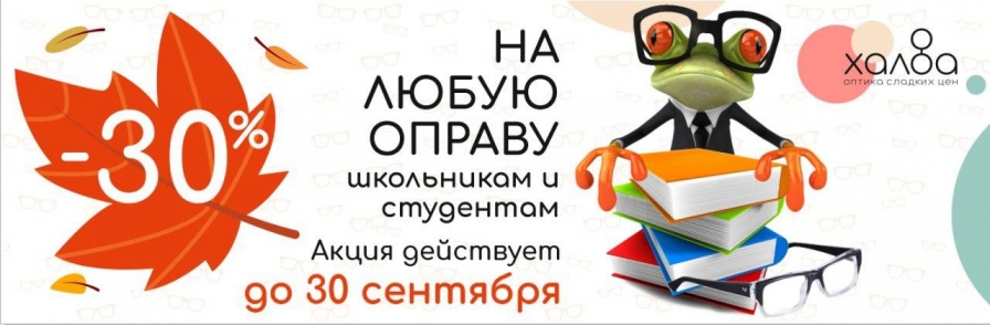 С 5 августа по 30 сентября в оптиках ХАЛВА на все оправы действует скидка -30% для школьников и студентов